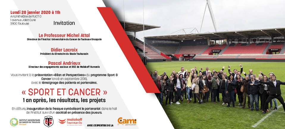 Une conférence sur les résultats et les projets du programme Sport et cancer lancé en septembre 2018 se tiendra le lundi 20 janvier 2020 à 11h00 à l'IUCT Oncopole. Avec la participation du Pr Michel Attal, directeur général de l'IUCT-Oncopole, Didier Lacroix, président du Directoire du Stade Toulousain, et Pascal Andrieu, directeur des engagements sociaux et RSE de Malakoff Humanis.