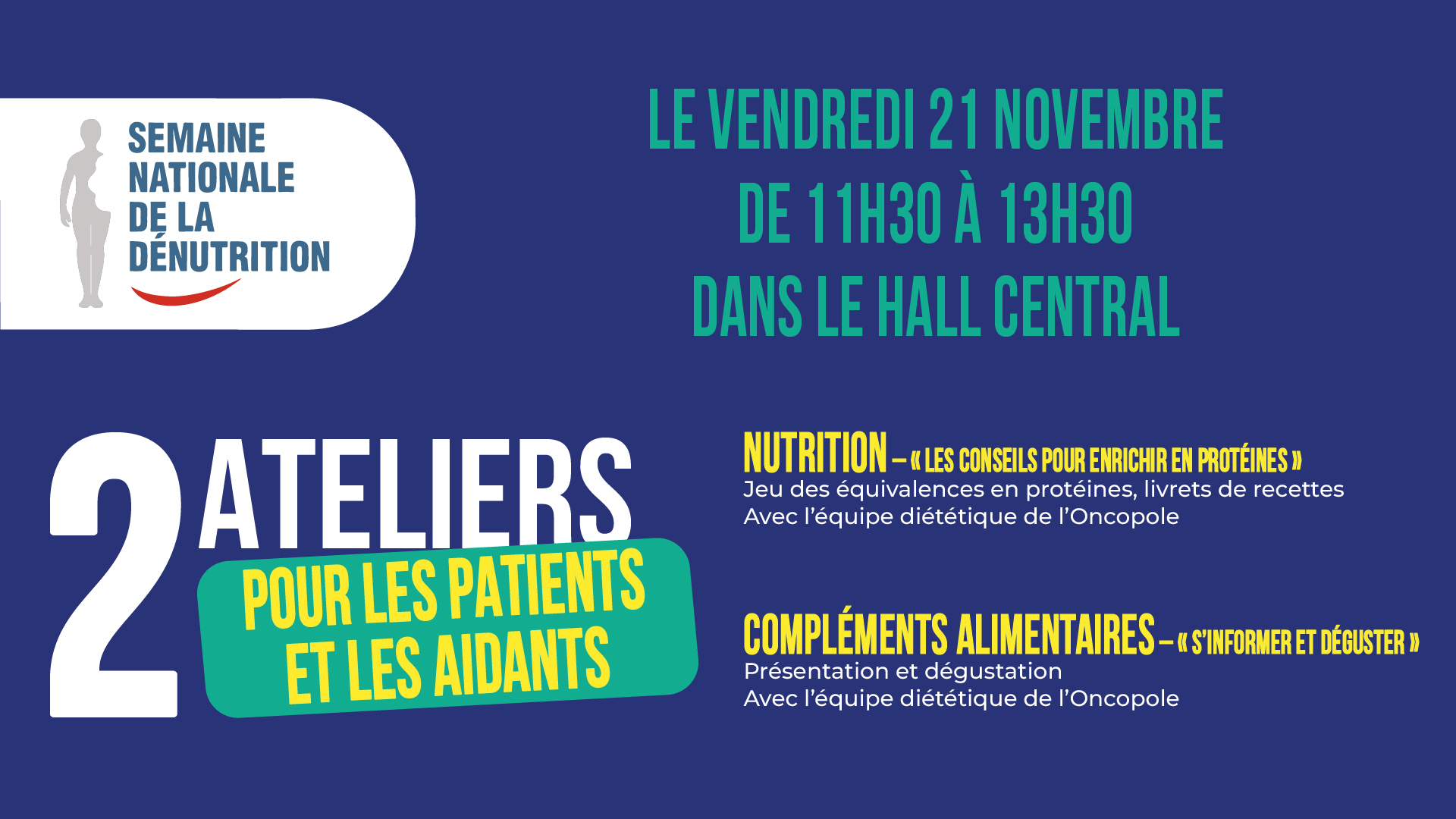 A l'occasion de la semaine de la dénutrition, l'équipe diététique propose deux ateliers pour les patients et les aidants le vendredi 21 novembre entre 11h30 et 14h30 dans le hall principal de l'Oncopole.
